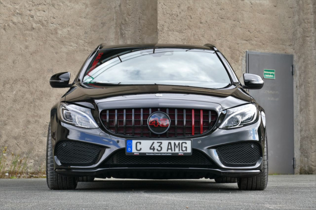 Karosserie: Lackierung in Obsidianschwarzmetallic, Panamericanagrill in Glanzschwarz und rote 43-Ziffer anstelle des Zentralsterns, rote Racinggitter im Grill, Umbau von Heckdiffusor und Auspuffblenden mit Original AMG-C63-Teilen, Typenschild auf Heckdeckel und Biturbo-Embleme auf Kotflügel entfernt, Stern und Chromleiste des Heckdeckels schwarz lackiert. Frontschürzenschwert und Alu-Dachreling schwarz lackiert, Bremssattel mit AMG-Logo und in Rot lackiert, C43-Logo auf der Frontscheibe