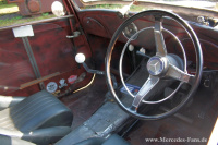 Da im linken Fußraum wegen dem dicken Getriebe kein Platz mehr für die Pedalerie war, wurde alles auf Rechtsteuerung umgebaut. Viele Extras hatte Ingo in diesem Falle ja nicht zu ändern, besteht das Interieur des Hot Rods lediglich aus dem gecleanten Originalarmaturenbrett, einem eingepassten Tacho von VDO, einem Zusatzinstrument im Handschuhfach, einem 60er Jahre Petri Lenkrad auf der umgebauten W124 Lenksäule und 60er Jahre Bucket Seats. Weder ein Teppich, noch sonstige als Innenausstattung zu erkennende Annehmlichkeiten sind zu finden, denn Ingo braucht nichts, was den Wagen nicht schneller macht.