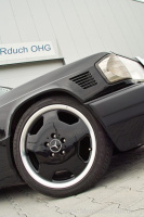 Optisch trumpft die Karosserie mit einer unifarbenen Lackierung auf. Da nunmehr auch Stoßfänger und seitliche Schutzplanken schwarz lackiert sind, verfügt der Mercedes über ein Respekt gebietendes Erscheinungsbild im attraktiven AMG-Look. Getönte mhw-Rückleuchten und schwarzgraue-Inpro-Blinker komplettieren die stimmige Präsenz. Außerdem dynamisiert der geschlitzte rechte Kotflügel eines 2.5 Turbos das Outfit des W201.