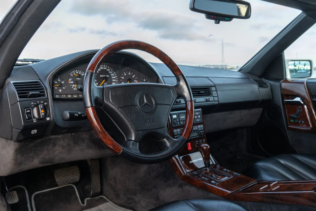 Der Innenraum dieses SL 72 verfügt über beheizbare und elektrisch verstellbare Sitze aus schwarzem Leder mit kontrastierenden Nähten. Das Polsterkonzept setzt sich im Armaturenbrett und in den Türverkleidungen fort. Die Wurzelholzverkleidung ist mit einer AMG-spezifischen Oberfläche versehen. Zu den inneren Werten dieser Mercedes-Roadster-Rarität gehören außerdem ein AMG-Lenkrad und ein Tacho mit 300 km/h-Skala.
