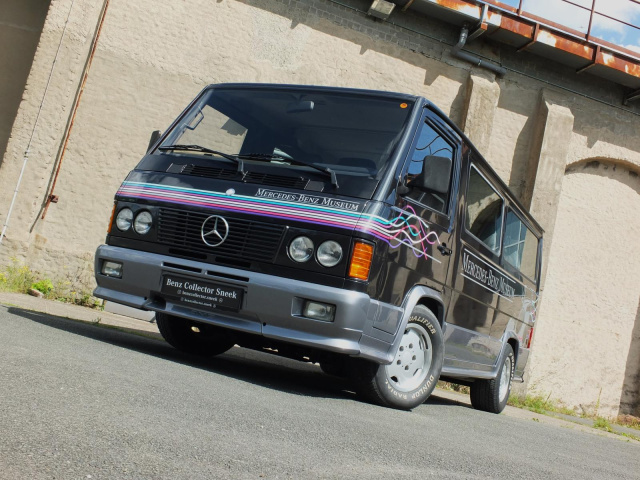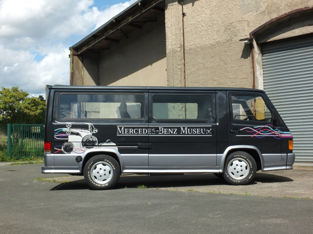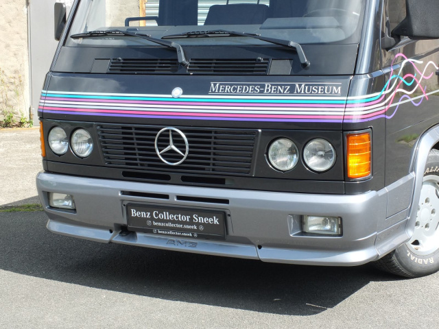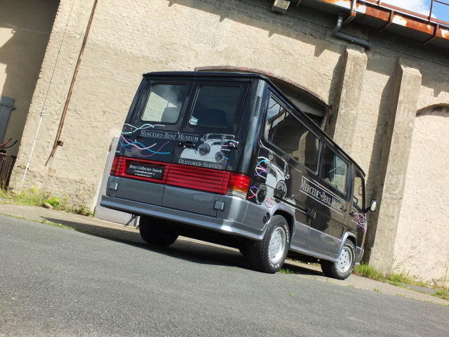 Das Exemplar des 43-Jährigen diente dem „alten“ Daimler-Musuem, das noch auf dem Werksgelände in Untertürkheim angesiedelt war, als VIP-Taxi, um besondere Gäste vom Parkplatz zu den Ausstellungsräumen zu chauffieren. Als Einsatzwagen in Diensten des Mercedes-Benz Museums erhielt der in Blauschwarz-Metallic lackierte MB 100 AMG exklusive Decals von der Firma Becker Design, welche seinerzeit auch die DTM-Rennwagen folierte. AMG bot für den MB 100 damals übrigens auch eine Lackierung in Perlmuttgrau-Metallic an.