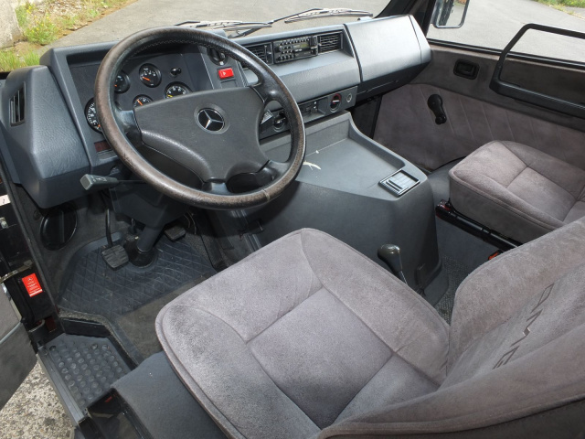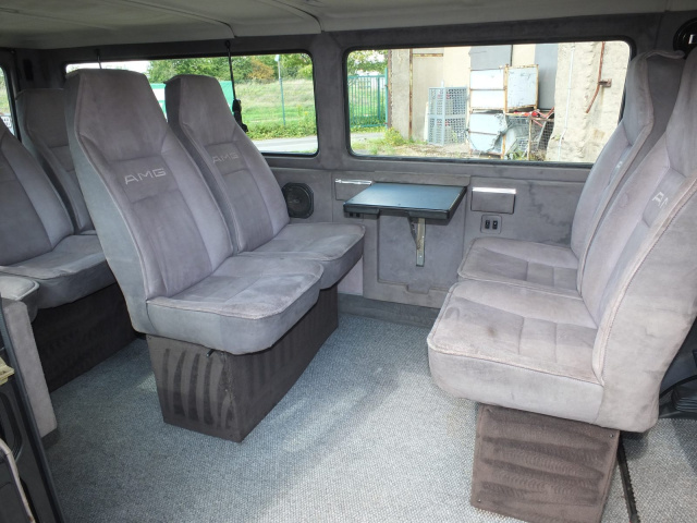 Um den Innenraum aufzuwerten, konnte der Kunden bei AMG aus verschiedenen Optionen - Leder oder Stoffinterieur - wählen. Ronalds MB 100 AMG ist mit Einzelsitzen, die mit grauem Velourstoff bezogen sind, ausgestattet. Ferner finden sich im Innenraum seines MB 100 Klapptische, eine hochwertige Stereoanlage sowie ein robuster Teppichboden nebst einer speziellen Instrumententafel mit einem Tachometer, der eine erweiterte Skalierung bis 200 km/h aufweist.