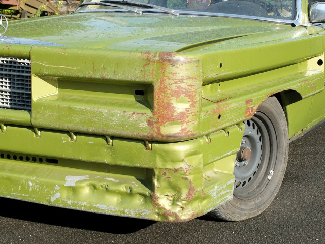 Wer diesen Mercedes-Benz 450 SE Baujahr 1978 zum ersten Mal erblickt, reibt sich ungläubig die Augen: Ein citrusgrün-metallic farbenes Ungetüm, dessen Front von grob angeschweißten Leitplanken geformt wird. Nicht elegant, nicht repräsentativ, sondern kompromisslos crash- und kampfbereit. Dieser Benz sieht nicht nur auf den ersten Blick außergewöhnlich aus, sondern auf jeden weiteren auch. Und das hat einen besonderen Grund.