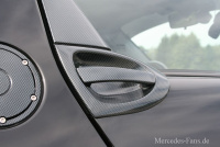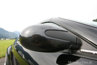 Den schwarzen Body hübschen etliche Applikationen im Carbon-Look auf. Im begehrten Kohlefaser-Look präsentieren sich Türgriffe und Türschalen, Spiegelkappen, der Steinschlagschutz an den hinteren Radläufen und die Scharniere der Heckklappe. Für einen stimmigeren Gesamteindruck wurden zudem der Aluminiumkühlergrill schwarz eloxiert und die Innengehäuse der Rückleuchten schwarz gefärbt.