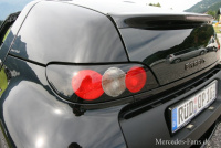 Individuellen Pfiff bringen daher die nachgerüsteten Brabus-Ledersitze in die Fahrgastzelle. Die schwarz eloxierten Schaltwippen der sequentiellen Sechsgangschaltung betonen den sportlich-ambitionierten Anspruch des Roadster-Piloten ebenso wie der Schaltknauf im Zylinderkolben-Design. Und mit den abgedunkelte Scheiben (Heckscheibe foliert, seitliche Makrolon-Scheiben lackiert) wechselt der Smart-Roadster vollends auf die dunkle Seite der Pracht.
