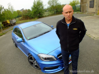 Nicht minder imposant ist die Heck-Optik geraten. Eine fulminant linierte Schürze greift den Look des Frontspoilers kongenial auf. Aus dem schwarzen Diffusor-Einsatz lugen die beiden großmäulig-ovalen Endrohre der Auspuffanlage. Das Outfit ist cool und zeugt von Charakter, konstatiert Michael und ergänzt: Der Mercedes fällt auf, ohne jedoch zu provozieren. So gefällt mir das.