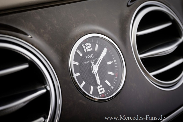 Eine perfekte Fahrzeugkontrolle erlaubt das AMG Sportlenkrad im 2-Speichen-Design. Der ausgeprägt konturierte Lenkradkranz ist mit Leder Nappa bezogen, im Griffbereich befindet sich perforiertes Leder. Die Spangenblende trägt einen charakteristischen AMG Schriftzug. Aluminium-Schaltpaddles erlauben die manuelle Gangwahl. Rechts neben dem AMG Sportlenkrad befindet sich zwischen den Lüftungsdüsen eine hochwertige Analog-Uhr im IWC-Design: Sie verfügt über dreidimensionale, gefräste Metall-Zeiger und echte Metall-Appliken auf dem Ziffernblatt. Hochwertige verchromte Türpins mit AMG Logo runden das exquisite S 65 AMG Interieur ab.