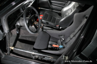 Der Fahrerseite wurde ein Recaro-Vollschalensitz angeordnet, das schrieb das Renn-Reglement vor und vermeintlich serientreu wirkt das Interieur mit seinen Stoffen und Verkleidungen. Der Schein trügt, das Material ist 30% leichter gegenüber der Serienausstattung.