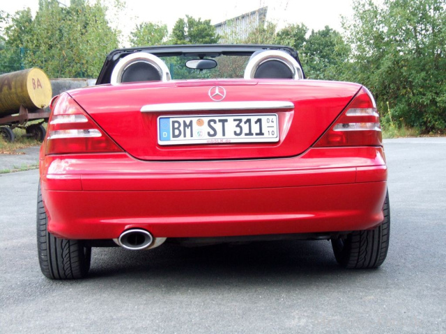 Dementsprechend fallen dem aufmerksamen Betrachter Chrom-Parts wie der Steg im schwarz lackierten Grill, die Türklinken, die Heckklappen-Griffleiste und die Rollbügel ins Auge. Gut stehen dem Mercedes R170 auch die Klarglas-Scheinwerfer und das 70 x 120-mm-Auspuff-Endrohr (Supersprint) zu Gesicht.