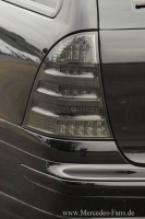 Mit den entsprechend kolorierten Teilen (Dachreling, Türgriffe, Wischerarme, Abdeckungen und Leisten in Wagenfarbe lackiert) wechselt der C 180 komplett auf die dunkle Seite der Pracht. Schwarz getönte Leuchten (Xenon-Scheinwerfer, LED-Rücklichter und dritte Bremslampe) runden den imponierenden Auftritt stimmig ab.