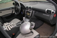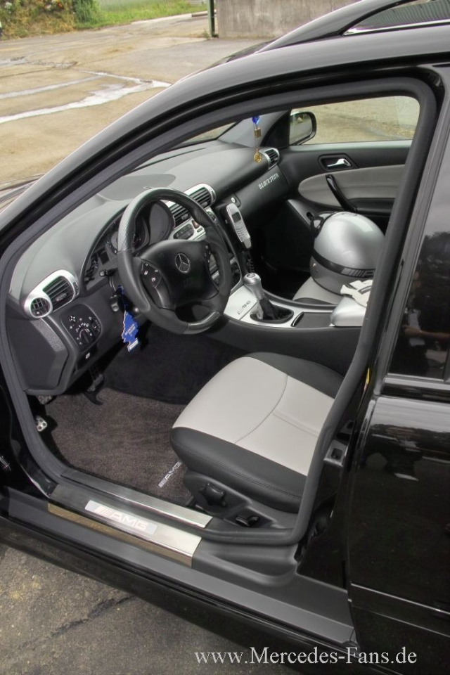 Innenraum: Sitze, Kopfstützen und Türverkleidungen mit grau-schwarzem Leder bezogen, Holz-Dekor und Luftdüsen (Mopf) in Alu-Look lackiert, Türgriffe in Wagenfarbe lackiert, Chromtürpins, AMG-Parts: Fußmatten, Sportlenkrad, Pedale (Sportpaket), Tacho (C55 AMG Mopf-Version), beleuchtete Einstiegsleisten. Beleuchtung komplett auf Weiß umgerüstet (insgesamt 186 neue LEDs)