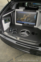 ICE: Kenwood-Headunit (DNX5220BT) mit VGA Touchscreen, integriertes Navigationssystem, USB-Anschluss im Handschuhfach, Ipod/Iphone Anschluss unter Armablage, Boxen und Woofer von Audio System, Twister-Endstufe, Kofferraum-Umbau:1 x 15Zoll Deckenmonitor von Blaupunkt für Fond Passagiere, 2 x 7 Zoll Hifonics Monitore, 1 x 27 Zoll LG Full HD LCD Monitor, Play Station 3 Slim Line, DVBT -Empfänger für TV Programme, Kofferraum komplett gecleant und mit Leder überzogen, Innenseite der Heckklappe ebenfalls mit Leder überzogen, eingesticktes AMG- und BlackStar-Logo, Bodenplatte mit Mercedes Stern aus Acryl (beleuchtet), Amplifier und Woofer in Ersatzradmulde