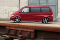 Karosserie: Lumma-Frontschürze verbreitert, nach unten verlängert und gecleant sowie Nebelscheinwerfer mit Standlichtringen integriert, Original-Heckschürze verbreitert, nach unten verlängert und Kennzeichenmulde sowie Auspuffdurchführungen eingebaut, Universal-Schwellerleisten umgebaut, angepasst und mit der Karosserie verbunden, Motorhauben-Umbau mit Lufthutzen und angesetztem Frontgrill sowie Verlängerung über den Scheinwerfern (böser Blick), Original-Belüftungsöffnungen entfernt, Änderung der Luftführung unter der Motorhaube, Radlaufbleche vorn und hinten aufgeschweißt und je 50mm verbreitert, Kotflügel über den Blinkleuchten verlängert, Türklinken entfernt und geänderten Öffnungsmechanismus installiert, Heckklappe und Schiebetür gecleant, Sprinter-Luftschlitze in den Kotflügeln rechts und links, Lumma-Heckflügel mit dritter Bremsleuchte, BMW-M3-Außenspiegel umgebaut und angepasst, Kurzstabantenne, Lackierung in candy apple pearl
