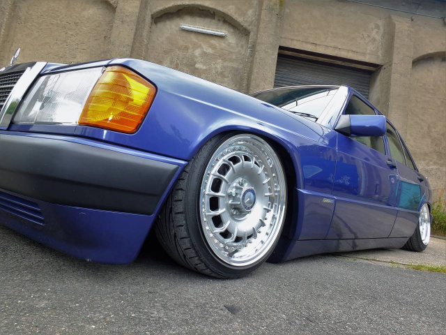 So weit. So gut. So original bestens? Nein, Karel wollte seinen W201 spezieller ins Rollen bringen. Auf Anbauteile konnte er zwar verzeichten, nicht aber auch auf Abbauteile! Und so stürzt also ein A Technix-Luftfahrwerk den Azzuro in den tiefblauen Untergang. Zugegeben, nicht jedem gefällt das. Aber effektief gelungen ist der dergestelt erreichte Eindruck schon irgendwie, oder etwa nicht