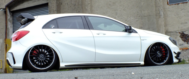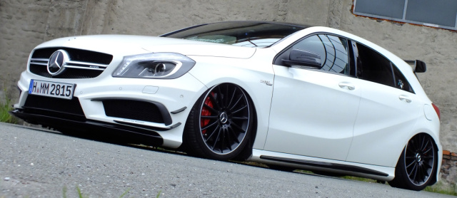 Eigentlich steht ein Mercedes A45 AMG für automobile Höchstleistungen. Aber in puncto Fahrwerk kommt der A-Klasse-Sportler von Michael Bühring eher als furioser Flachmann daher. Möglich macht's das verbaute Air-Force-Airride, welches das Top-Modell der Baureihe W176 in dramatischer Weise zu Boden zwingt.