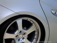 In welche Schublade man den Mercedes C219 aber auch immer stecken mag: Einigkeit herrscht bei allen Betrachtern ganz sicherlich in der Feststellung, dass der langgestreckte CLS dank seiner kraftvollen Linienführung aus jeder Perspektive optisch überzeugt. Erst Recht gilt dies für Fabians CLS 500, der überdies mit einem imageträchtigen AMG-Look aufwartet. Zudem betonen die um 15 mm verbreiterten vorderen Kotflügel die sportliche Charakteristik des Mercedes.