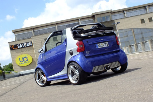 Keine Frage: Dem Smart-Cabrio steht das kraftvolle Topping ebenso gut wie dem kultigen Mercedes-Roadster. Auf die Macht der Farbe allein wollte sich der Heiligenhauser jedoch nicht verlassen, um das Image seines Fortwo zu steigern. Vielmehr verhalf er der Karosserie mithilfe stimmig zusammengestellter Details zu einer dynamischen Formsprache.