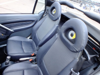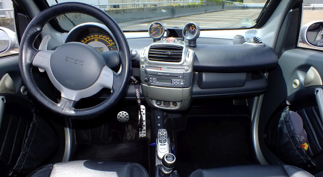 Innenraum: Dreispeichen-Lenkrad mit Schaltwippen vom Smart Roadster, Brabus-Schaltknauf mit Starter-Knopf, Brabus-Pedalerie, Roadster-Sitze, Leder-Elemente (Brabus-Leder), Tachometer bis 200 km/h skaliert, Edelstahl-Überrollbügel