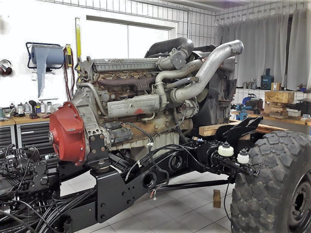 Als Motor kommt ein OM906 LA aus einem Freightliner FL70 zum Einsatz, der ebenfalls überarbeitet wurde. Im Freighliner schöpft er aus 6,4-Liter-Hubraum bis zu 300 PS. Wieviel Drehmoment und Leistung der Reihensechszylinder-Diesel im Rennunimog auf den Allradantrieb wuchtet, möchten seine Macher nicht verraten...