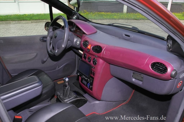 Karosserie: Brabus-Frontschürze mit Tagfahrlicht von Dectane, Schwellerleisten, Heckschürze und Dachkantenspoiler von Lumma, A 210-Heckklappenspoiler, Bauteile von der Modellpflege nachgerüstet: Scheinwerfer, Avantgarde-Rückleuchten, Leisten, Türgriffe; Scheinwerferblenden von Inden-Design, Mattig-Sportgrill mit oberer Chromleiste, Mattig-Sportspiegel, mhw-Seitenblinker mit Chromlampen, Scheiben ab B-Säule getönt, US-Standlicht, Motorhaube und Tankklappe in Echtcarbon, Lackierung in Vulkanrot-Metallic, Pinstripes