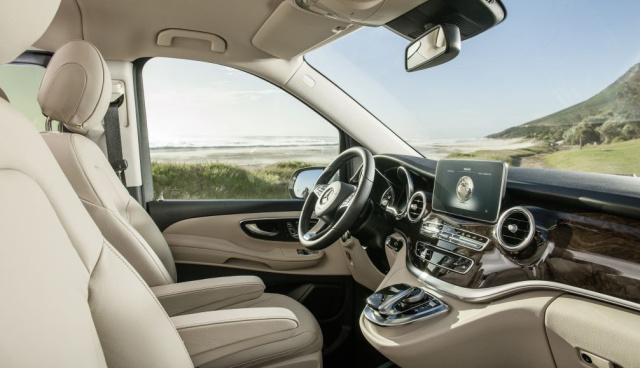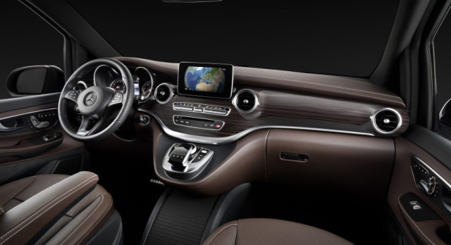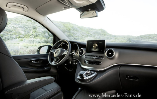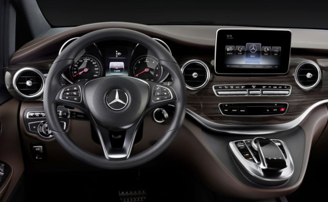 Mit ihrem sportlichen Charakter und ihrer komfortablen Ausstattung nimmt die neue Mercedes-Benz Großraumlimousine die Spitzenposition in ihrem Segment ein. Bereits die Serienausstattung der Basisausführung V-Klasse fällt reichhaltig aus. Dazu gehören unter anderem das Audio 20 USB mit frei stehendem 7-Zoll-Zentraldisplay, Zierelemente in Klavierlackoptik, 3-Speichen-Multifunktionslenkrad mit zwölf Tasten und sportlichem DIRECT SELECT Wählhebel mit Lenkradschaltpaddles bei Automatikgetriebe, in Neigung und Höhe verstellbare Lenksäule, Komfortsitze für Fahrer und Beifahrer mit Thorax-Pelvis-Sidebag, elektrische Feststellbremse und aktiver Feststeller der Fondschiebetür.