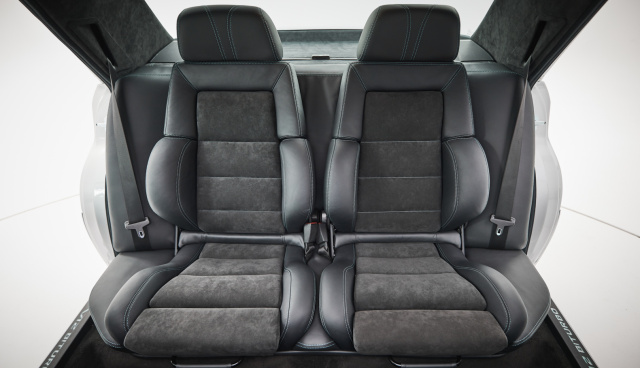 Der Innenraum des 500 E wurde komplett neu beledert. Instrumententräger und Recaro-Classic-Sitze (Einzelsitzanlage im Fond) sind mit gestickten 'PETRONAS grün'-Nähten noch schöner anzusehen. Sehr ansehnlich sind auch Carbon-Dekore, der Alcanatara-Himmel und die beleuchteten V12-Biturbo-Einstiegsblenden.