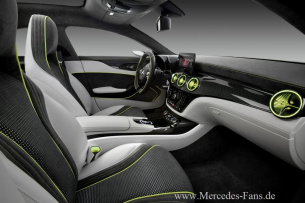 Die vier Integralsitze mit integrierten Kopfstützen stammen aus der Sportversion der neuen A-Klasse. Eine galvanisierte Spange oben im Sitz schafft optische Leichtigkeit und ist beleuchtet. Die Form der Luftdüsen in der Instrumententafel erinnert an die Triebwerke eines Jets. Hinterleuchtet ausgeführt, ändern sie wie beim Concept A-CLASS ihre Farbe, abhängig davon, welche Temperatur die Insassen bei der Innenraumklimatisierung wählen. Wird kalte Frischluft in den Innenraum geführt, sind sie blau, bei warmer Luft hingegen erstrahlen sie rot. Bei einer mittleren Temperaturstellung sind die Luftdüsen in fluoreszierendem Gelb gehalten und damit perfekt farblich abgestimmt auf die Keder.
