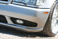 Karosserie: Alle Radläufe um 2 cm gezogen, Stoßstangen aus GFK angefertigt und mit Designelementen vom SL 55 AMG versehen, Luftgitter vom R230 in die Kotflügel eingelassen, Türschlösser entfernt und Griffe in Wagenfarbe lackiert, 1997er Kofferraumdeckel mit W203 Stern, rot-schwarze Klarglas LED-Rückleuchten, Klarglas Xenonscheinwerfer und klare US-Blinker mit Scheinwerferblenden, LED Seitenblinker, BMW Begrenzungsleuchten, LED Standlicht und Nummernschildbeleuchtung, Avantgarde Grill, weiße LED Umfeldbeleuchtung in Stoßstangen und Seitenschwellern