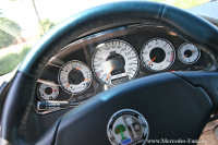 Innenraum: 365mm Raid Airbaglenkrad, Tachogehäuse vom R129 Edition, AMG-300km/h-Tacho, Plasma Tachoscheiben, Chromrahmen an Lüftungsdüsen und Schaltkulisse, Audi Wurzelholz Schalthebel, Edelstahlpedale vom R230, Chromleisten an den Türen, beleuchtete Mercedes Einstiegsleisten, Alu Riffelblechfußmatten, blaue LED Innenbeleuchtung, blaue Fußraumbeleuchtung, Kofferraum blau beleuchtet und mit Alu Riffelblech, bzw. Spiegeln ausgekleidet