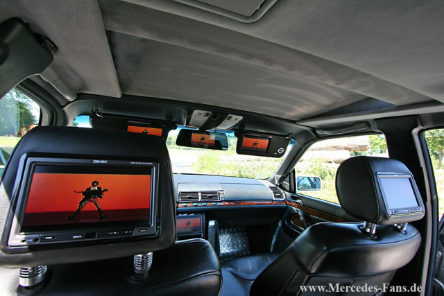 ICE: Kenwood KFT 627 DVD Headunit mit 6 TFT-Monitor, neun weitere 7-Monitore im Innenraum (2x Sonnenblenden, 1x Rückspiegel, 2x Kopfstützen, 1x Mittelkonsole hinten und 3x Kofferraum), Zenec DVD Player in der Heckablage, 30 GByte iPod, DVB-T, Kenwood Navigation, Bose Soundsystem, zwei 5fach A/V-Signalverteiler zur individuellen Monitorsteuerung, zwei 30er Subwoofer von Crunch, 1500 Watt Endstufe, 5 Farad Dietz Kondensator