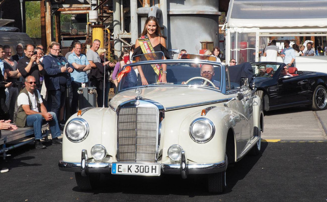 Gediegen cruist Hans Schulte Oversohl seinen W 186 III auf die Mercedes-Benz Classic Showbühne bei SCHÖNE STERNE. Auf dem Rücksitz: Miss Germany Anahita Rehbein. Ein Bild für die Götter, hier passt einfach alles. Dieses Adenauer Cabriolet - ein 300 b Cabrio D - aus dem Jahre 1954 scheint für den Anlass das perfekte Gefährt. Elegant und zeitlos schick präsentiert sich das „S-Klasse Cabriolet“ den staunenden Blicken der Zuschauer. Bei diesem Modell handelt es um eins von nur 125 gebauten Fahrzeugen. Das Adenauer-Cabriolet von Hans Schulte Oversohl wurde an Daimler-Benz New York ausgeliefert und am 1. Juli 1954 das erste Mal zugelassen.