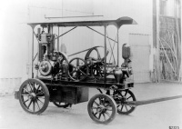Er baut mit Zustimmung des Gemeinderates eine kleine, von seinem Motor angetriebene Bahn für die Strecke vom Cannstatter Kursaal zum Wilhelmsplatz. Ähnliche Bahnen erfreuen sich in weiteren Städten ebenfalls großer Beliebtheit. Auf dem Feuerwehrtag 1888 in Hannover erregt eine motorbetriebene 4-PS-Feuerspritze (rechts im Bild) großes Aufsehen, und das vom Leipziger Buchhändler Wölfert konstruierte Luftschiff fährt mithilfe des Daimler-Motors die vier Kilometer von Cannstatt nach Kornwestheim.