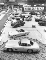 Auf Anregung von Maximilian E. Hoffman, dem USA-Importeur der Marke, entwickelt Mercedes-Benz 1954 den 300 SL Rennsportwagen zu einem Seriensportwagen weiter. So entsteht der legendäre 300 SL Flügeltürer (W 198), der vom Wettbewerbsfahrzeug unter anderem den leichten und stabilen Gitterrohrrahmen übernimmt.