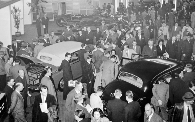 IAA 1951: Mercedes-Benz meldet sich mit den Personenwagen 220 (W 187) und 300 (W 186) auf dem internationalen Parkett zurück. Das Foto zeigt Limousine und Cabriolet des 300 umlagert auf dem Messestand.