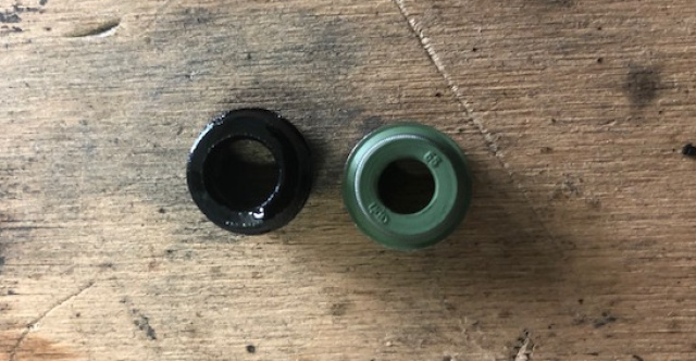Kaum war ich von Becker in Oberhausen zurück, war auch schon das letzte der 18 Ventile des Zombie in Arbeit. Der klebrige Haufen alter Ventilschaftdichtungen, der sich inzwischen angesammelt hatte, zeigte ziemlich anschaulich, warum der Zombie beim Starten immer qualmte und Öl soff, wie Keith Richards Bourbon: Die Gummidichtungen waren knallhart und um fast das Doppelte vergrößert!