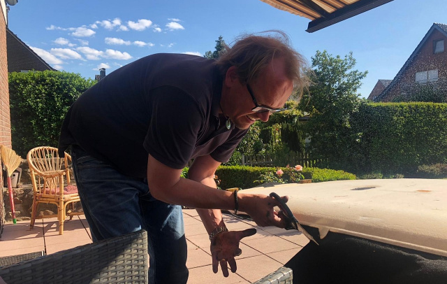 Ach ja, bevor ich es vergesse: Sollte jetzt jemand ebenfalls einen Innenhimmel mit Sika-Flex einkleben wollen, ZIEHT EUCH EINWEG-HANDSCHUHE AN. Ich habe da nicht dran gedacht und hatte selbst nach zwei Durchgängen mit Nitroverdünnung und 30 Minuten Schruppen mit der Wurzelbürste Reste von dem Zeug an den Händen. Meine Hände fühlten sich danach an, wie die Pfoten einer Katze nach einem Tag im August auf einem Garagendach und waren stundenlang rosa-schwarz gescheckt. Ich ahne, warum der Typ aus der Carglas Werbung immer Handschuhe anhant...