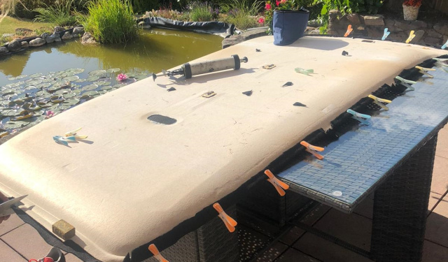 Der Ausbau des Himmels ist zugegebenermaßen etwas fummelig, da der 210er schon zur Clip-und-Click Generation gehört und nicht wie seine Vorgänger grundsätzlich durch Schraube und Muttern zusammengehalten wird. Nach erfolgter Demontage habe ich erstmal die ekelig klebrigen Schaumstoff-Polster-Reste zusammen mit dem Original-Bezug entsorgt und die Platte mit einer groben Bürste sauber gemacht. Auf evtl. vorhandenen Resten des klebrigen Schaumstoffes hält auch Sika-Flex schlechter, als auf einer glatten Unterlage.