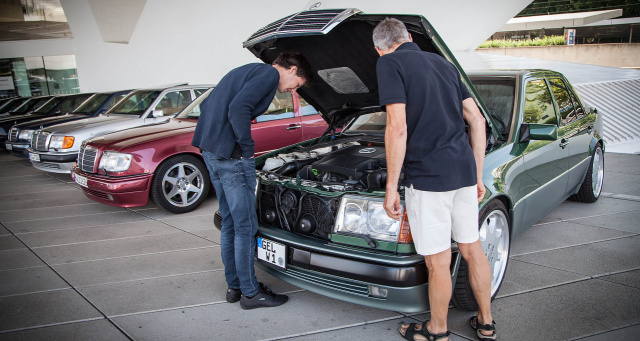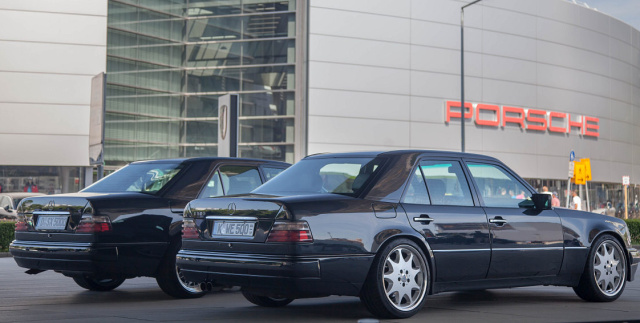 Morgens um 9 Uhr trafen sich am vergangenen Wochenende die ersten Teilnehmer. Die leise blubbernden V8 Mercedes-Benz Flaggschiffe 500E durften mit Sondergenehmigung direkt vor dem Eingang des Porsche Museums parken. Da standen zufällig ein paar Herren im besten Alter und schauten zu, wie sich die Reihen der imposanten Fahrzeuge füllten. Arkady, ein Mitglied der Mercedes Gruppe, erklärte den Herren, dass diese Mercedes von Porsche gebaut wurden. Die Antwort: „Das wissen wir, wir haben die damals gebaut, genau wie den Porsche 959. Wir sind ehemalige Porsche-Mitarbeiter.“ Welch ein Zufall! Nicht alle Museumsbesucher waren so gut Informiert. Die Besitzer der insgesamt 35 Mercedes-Benz-Dickschiffe wurden immer wieder angesprochen, warum hier so viele Mercedes am Porschemuseum stehen, und standen hilfsbereit Rede und Antwort.