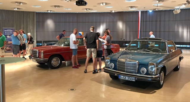 Eigens für das Strich-Acht-Treffen stellte das Mercedes Benz Museum den großen Saal im Erdgeschoss zur Verfügung, den die Strich-Acht-Fans mit eigens mitgebrachten Exponaten und versammeltem Fachwissen füllten. Zur Mittagszeit versammelten sich Experten aus der W114/W115 Ära zur kurzweiligen Podiumsdiskussion. Moderator Martin Kämmerling, der als Clubmitglied unter anderem den Stammtisch Stuttgart leitet, führte durch die Gespräche. Ingenieur Frank Knothe, der in der MB PKW Sparte über Jahrzehnte hinweg stark an der Entwicklung der Mercedes Benz SL-Reihe beteiligt war, gab Geschichten über die Modellpalette und -entwicklung der /8 Baureihe zum besten. Ralf Kühl, Clubmitglied und Restaurator aus dem norddeutschen Krogaspe, sprach als Fachmann für die Instandsetzung und Restauration von /8 Modellen. Ferner bereicherte die Gesprächsrunde Peter Schneider, Präsident des Deuvet, der maßgeblich an der Einführung und Klassifizierung historischer Kennzeichen und 07-er Kennzeichen beteiligt war, Wolfram Uhde als Vertreter für den Mercedes Benz Vertrieb, sowie Taxiunternehmer Friedhelm Kämmerling.