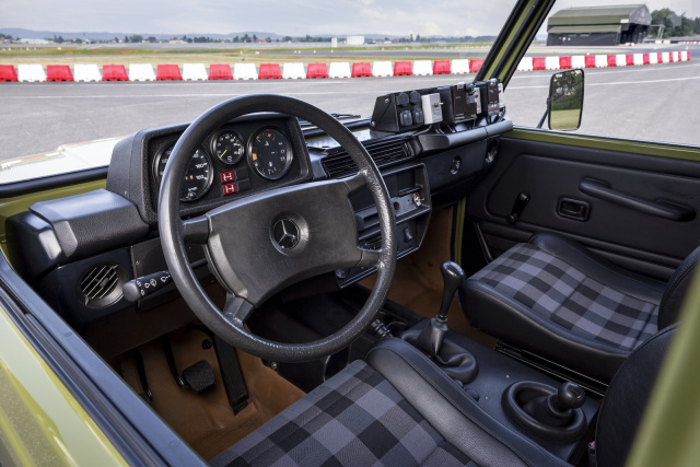 Das gilt selbst für das Topmodell den 280 GE. Dessen 2,8 Liter großes M-110-Triebwerk leistet Dank Einspritzung in Modellen wie dem 280 E oder einem 280 SE 136 kW / 185 PS. Drehmomentoptimiert reduzierte sich diese im Geländewagen aus der Steiermark auf 115 kW / 156 sonor trampelnde Pferde. Gekoppelt an obligatorischen Allradantrieb und Fünfgangschaltung sind daher auf der Autobahn nach Graz von der Baureihe W 460 keine Geschwindigkeitsrekorde zu erwarten, die zumindest jenseits der deutsch-österreichischen Grenze ohnehin die Tempolimits des Alpenstaates verhindern. Zum schnellen Fahren ist die G-Klasse auch als 280er nicht gedacht; das spürt man schnell, als es erste Steigungen auf der Autobahn A8 hinaufgeht. Der Kilometerzähler zeigt nicht einmal 60.000 Kilometer; lässt durch die fehlende sechste Stelle im Rundinstrument jedoch offen, ob der grüne Hochsitzbeau nicht zumindest knapp 160.000 Kilometer auf der Uhr hat. Am Zustand des Innenraums lässt sich dies kaum ablesen, denn statt der üblichen Normalsitze verfügt der 280 GE über exzellente Sportsitze im originalen Kariert-Look aus den 1980ern.