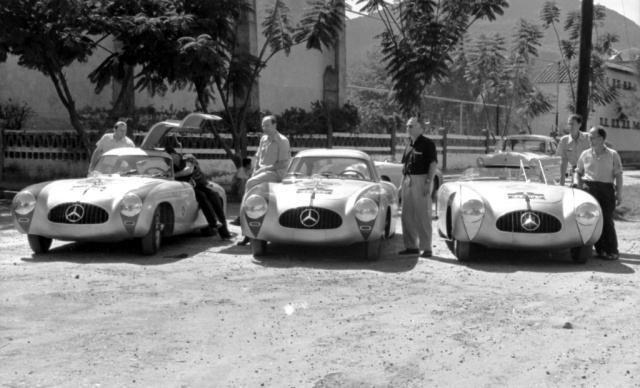 Carrera Panamericana Mexico, 1952. Mercedes-Benz Rennmannschaft von links: Hermann Lang, Erwin Grupp, Hans Klenk und Karl Klink am Mercedes-Benz 300 SL-Coupé (W 194), John Fitch und Eugen Geiger am Mercedes-Benz 300 SL-Roadster (W 194).