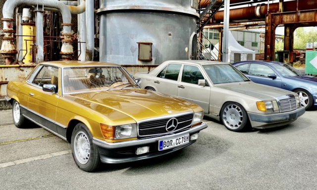 Eine Vorentscheidung fiel dann beim großen Mercedes-Festival SCHÖNE STERNE im August in Hattingen. Dort stand das Projektauto 400E neben einem byzanzgoldenen Mercedes-Benz 350 SLC der Baureihe 107. Mit Gold hatten wir uns bis dato noch gar nicht auseinandersetzt, aber warum einen W124 nicht in einem original Mercedes-Goldton lackieren?