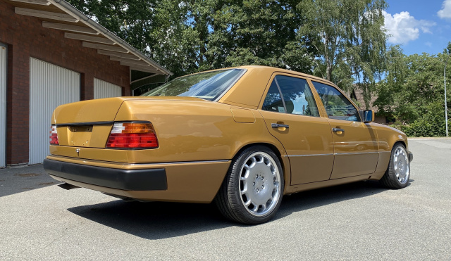 Als sich der Vorhang legte und der Benz auf einmal in "Californian Rockhard Gold" vor uns stand, wussten wir nicht so recht ob wir weinen oder jubeln sollten - so eine geile Farbe haben wir auf einem W124 wohl noch nicht gesehen. Volltreffer! Die glanzgedrehten Felgen im "Teller-Design" harmonieren fantastisch mit dem Lack. Die H&R-Tieferlegung tut ihr übriges und lässt den 400E sportlich, elgant dastehen. Kaum zu glauben, dass dieses Fahrzeug nun schon über 30 Jahre alt ist. "Californian Rockhard Gold" lässt den W124 durchaus modern erscheinen und passt einafch sehr gut zu einem Fahrzeug, welches aus Kalifornien stammt. Je nach Licht- und Sonneneinstrahlung wirkt der Goldton immer unterschiedlich. Geht man mit den Augen ganz nah an den Lack heran, erkennt man kleine Partikel im Lack, die für einen minimalen Flakeeffekt sorgen. Die Kamera kann das gar nicht einfangen. Sagenhaft! Das müsst ihr euch bei SCHÖNE STERNE wirklich mal mit eigenen Augen ansehen!