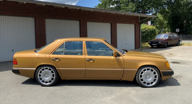 Gänsehaut-Moment in Rosengarten. Endlich durften wir unseren frisch-lackierten Mercedes-Benz 400E mal mit eigenen Augen sehen. Aus Smoke Silver/Rauchsilber (702) wurde "Californian Rockhard Gold". Damit ist dieser W124 das erste Fahrzeug der Welt, dass diesen speziellen Lack tragen darf. Entwickelt wurde der Farbton im BASF Color Design Studio in Münster. In den letzten Monaten hat das Team von Krüger Classic ganze Arbeit geleistet und den 400E mit jenem Gold überzogen. Das Golddepot von Fort Knox ist um einen W124 reicher, so würde es Schurke Goldfinger formulieren.