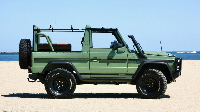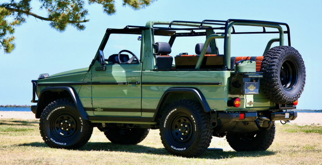Dazu kommen zusätzlich LED-Scheinwerfer und Rücklichter, ein Bluetooth-fähiges Soundsystem mit vier Lautsprechern, eine im Armaturenbrett integrierte Klimaanlage und seitlich klappbare Bänke hinten hinzu. Im Interieur findet sich eine neue Polsterung mit schwarzen Lederakzenten und cremefarbenen Zierelementen. Der Anstrich von außen erfolgte in „boxwood green glossy“. Je nach Außenbedingungen kann das schwarze Mohair-Verdeck den Wolf vor Regen und Schmutz schützen.