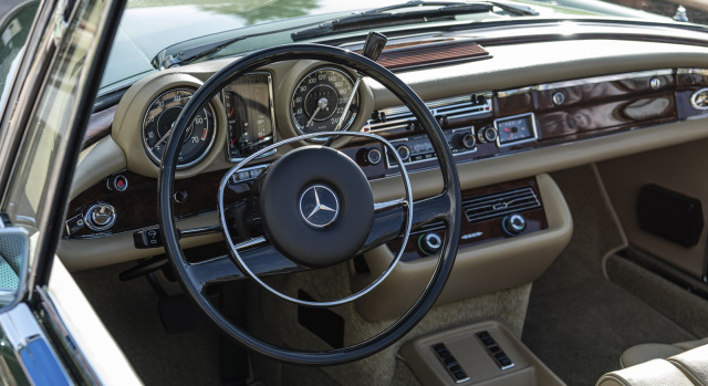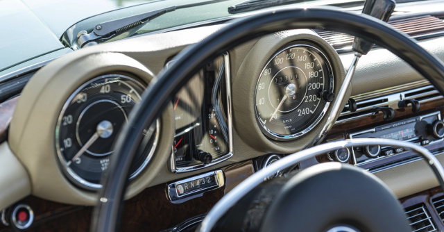 Der große Benz fuhr jedoch nicht nur in Sachen Leistung und Fahrkomfort im Cabrio-Segment ganz vorne mit. Dreipunktgurte, Knautschzonen, Scheibenbremsen rundum und die Keilzapfen-Türschlösser versprachen ein für damalige Zeiten beachtliches Sicherheitsniveau. Die steil aufragende Scheibe ist auch ohne Windschott ein solider Windschutz, auch wenn Aerodynamiker dabei wohl die Hände über dem Kopf zusammenschlagen. Im Innern gibt es neben weichem Leder, Radio mit elektrischer Antenne und Holzdekor allerhand Luxuszierrat, wie es wohl nur ein Modell der 70er Jahre tragen kann.