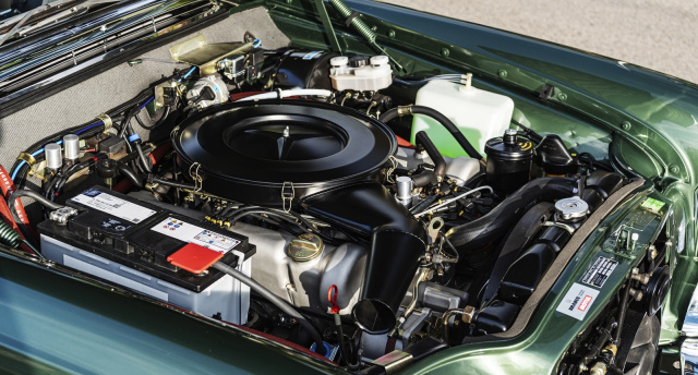 Das eigentliche Highlight des Wagens schlummert jedoch unter der Haube. Der 3,5 Liter große V8-Motor kam 1969 als Neuentwicklung an Bord und leistete 147 kW / 200 PS bei 5.800 Umdrehungen. Auch nach fünf Jahrzehnten kann der Achtzylinder allemal seine Insassen beeindrucken. Mit stoischer Ruhe gleitet der Wagen wie ein Kreuzfahrtschiff über die Straße, der Stern auf der Haube geht als Lotse voran. Der hydropneumatische Niveau-Ausgleich an der Hinterachse bügelt alle Unebenheiten glatt wie ein beflissener Diener die Falten am Anzug seines Herrn. Die Viergang-Automatik schaltet dabei so weich, dass sie sich selbst hinter manchen modernen Automaten nicht verstecken muss.
