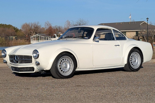Kaum zu glauben aber wahr: Unter dem Kleid dieses Sterns steckt ein Mercedes-Benz SLK 320 aus dem Jahr 2001, lackiert in Weiß mit einem schwarzen Innenraum. Bemerkenswert ist, dass dieser SLK mit einer abnehmbaren Karosserie eines Volkswagen Karmann Ghia von 1974 ausgestattet wurde. Hinzu kommt ein Mercedes-Benz-Kühlergrill, eine nachgerüstete Frontschürze und verbreiterte Radlaufverkleidungen sowie 16-Zoll Räder. Ein echter VolksBenz.