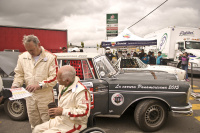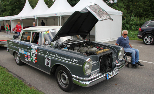 Traumwagen werden auf Anhängern angeliefert. Ganz besonders liebe ich es, wenn die Oldtimer auf eigener Achse anreisen. Die Boxenzelte füllen sich langsam mit Leben und die Rennfahrer richten sich ein. So war es auch, als MIB auf Egon Tauscher, seine Frau Gina und Hündin Luna, beim Solitude Revival vor den Toren von Stuttgart traf. Der Anblick des Gespanns war atemberaubend, als es sich seinen Weg durch das Durcheinander der anreisenden Teilnehmer, zu seinem Stellplatz bahnte. Der Benz im Renntrimm der Carrera Panamericana auf eigener Achse ist schon eine Augenweide.