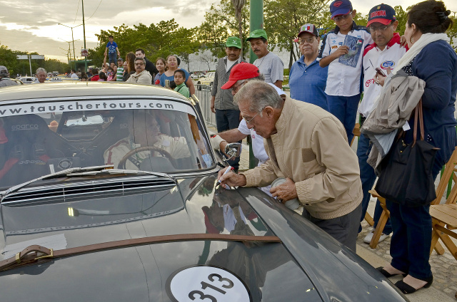 Die Nacht vor dem Start war an Tiefschlaf kaum zu denken. Früh morgens um 4:30Uhr musste Egon Tauscher aufstehen. Er packte seine Sachen und fuhr eine Stunde, bis er das Startareal, welches weit vor den Toren der Stadt lag, erreichte. Um sieben Uhr starteten die ersten Teilnehmer. Endlich durfte auch die Heckflosse vom Bodensee in Mexiko auf die Strecke. Mit Vollgas durch Ortschaften, über Kreuzungen und durch Wälder, über Bergpässe mit Serpentinen und ungesicherten Straßenrändern, neben denen meist bedrohliche Abgründe lauerten. Die Rennfahrerlizenz erlaubt einem auf der teilweise abgesperrten Strecke Vollgas zu geben. Mit dem Tunnelblick und viel Mut wird permanent am Limit gefahren. Das ist keine Oldtimertour, wo während der Fahrt nebenbei Blümchen gepflückt werden. Das ist knallharte Rennaction. Im Feld kämpfte Egon Tauscher gegen die leichteren Porsche 911, er lieferte sich Zweikämpfe mit Volvo Amazonen und Datsun 240. Kopf an Kopf und Tür an Tür. Spät in der Nacht fällt man nach so vielen Eindrücken, Konzentration und Adrenalin erschöpft in die Federn.